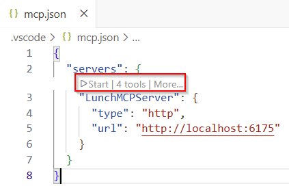 We can use Visual Studio Code as an MCP client, and test whether the MCP Server is working as expected or not (we also need access to GitHub Copilot in Visual Studio Code) . In our case, we created an mcp.json file in the workspace, which defines that the server is running in the local machine using http protocol (not https, as it seems there are some issues) and port 6175 (you can change it for another one as long as it is not being used by another process):