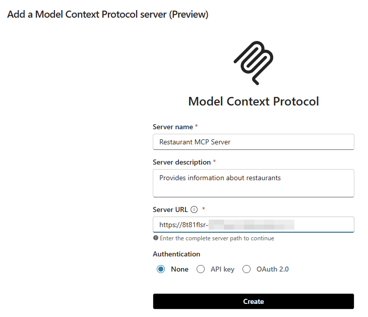 In any agent designed with Copilot Studio, we can Add a Model Context Protocol server (Preview) and enter the required fields (server name, description, URL and authentication method):
