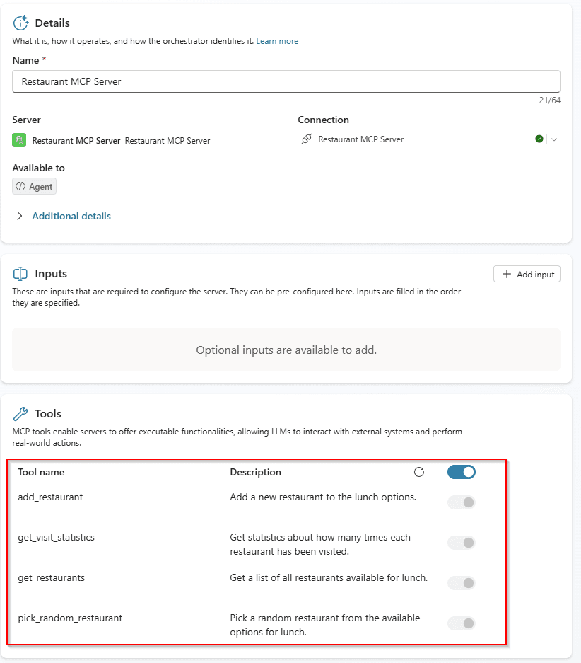 At this point we should be able to configure the MCP Server: Name, input values, and most importantly, tools and resources that will be used by our agent: