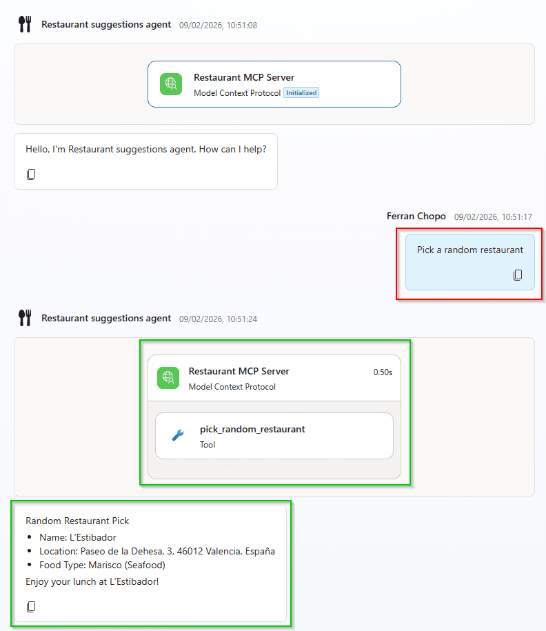 Now we should be ready to test the MCP Server from our agent, using any prompt that will trigger a call to any of the tools. For instance, if we write something like “Pick a random restaurant“, the activity shown by Copilot Studio would be the following: