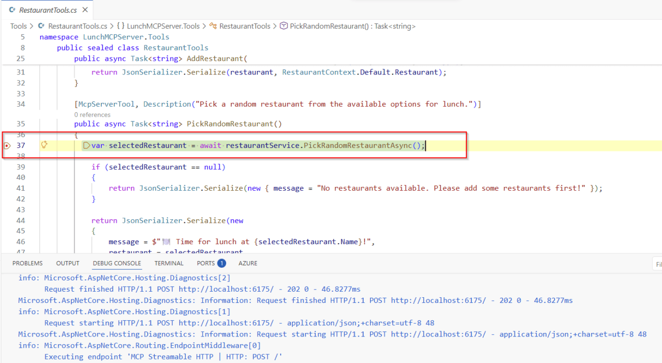 Based on the Lunch Roulette MCP project built by James Montemagno, we decided to build the same MCP server, which has the following tools: Get restaurants, Add restaurant, Pick random restaurant and Get visit statistics. An important difference is that our project is accessible via the HTTP protocol, whereas the original project is not (it creates an executable file).