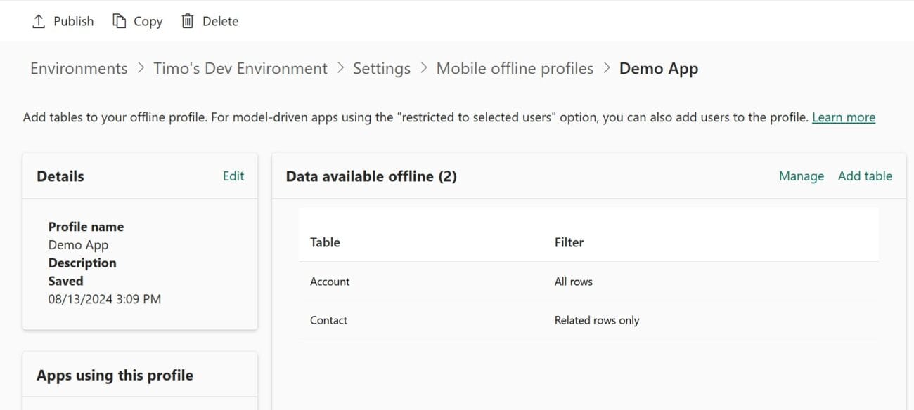 - Add the tables needed for the display to the offline profile. Think about the logic for synchronizing the tables’ rows.