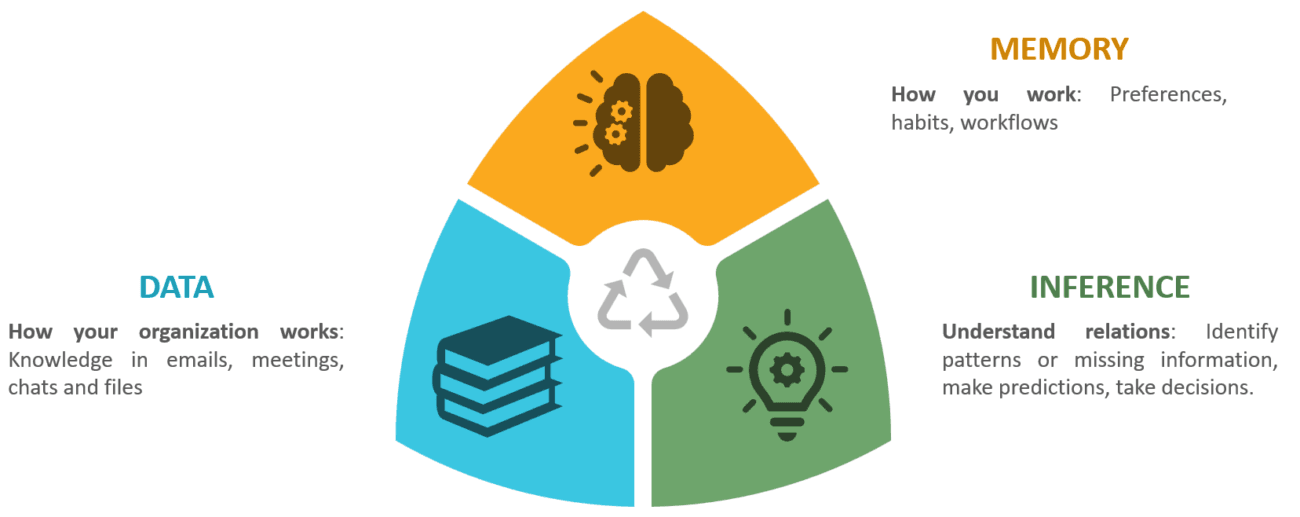 - Memory: Memory allows Work IQ to understand how individuals and teams work over time. It captures preferences, recurring patterns, relationships, and context. This enables Copilot and agents to stay consistent across interactions and adapt responses to the user’s role, habits, and trusted sources.
