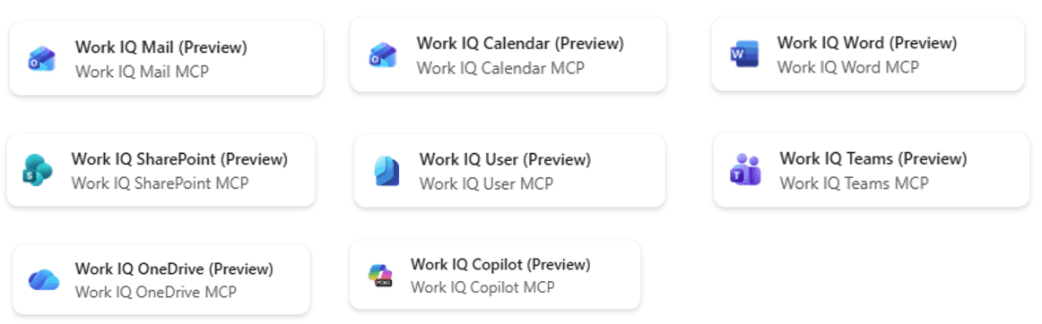 Work IQ extends custom agents in Copilot Studio through Model Context Protocol (MCP) servers, which connects our agents to a specific service in Microsoft 365. In the following picture we can read the MCP servers currently available: