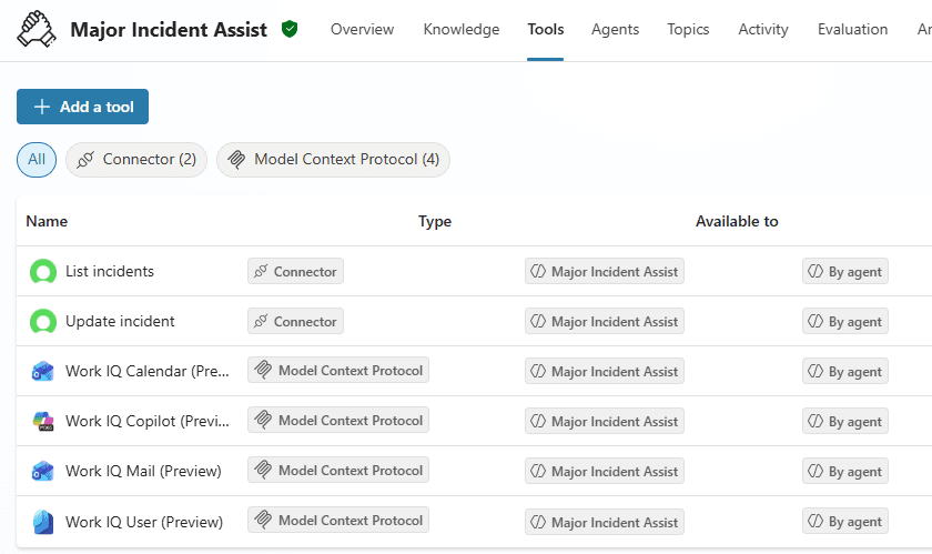 On the other hand, using Copilot Studio we can build an agent that acts as a single reasoning layer that orchestrates work across systems. Through Work IQ and MCP servers, the agent can access email, calendar, Microsoft 365 content and external platforms like ServiceNow in a structured, governed way. And the most important element: MCP servers expose these systems as tools the agent can reason over, allowing it to summarise conversations, retrieve live incident data, suggest meeting times, and surface relevant knowledge in one flow.