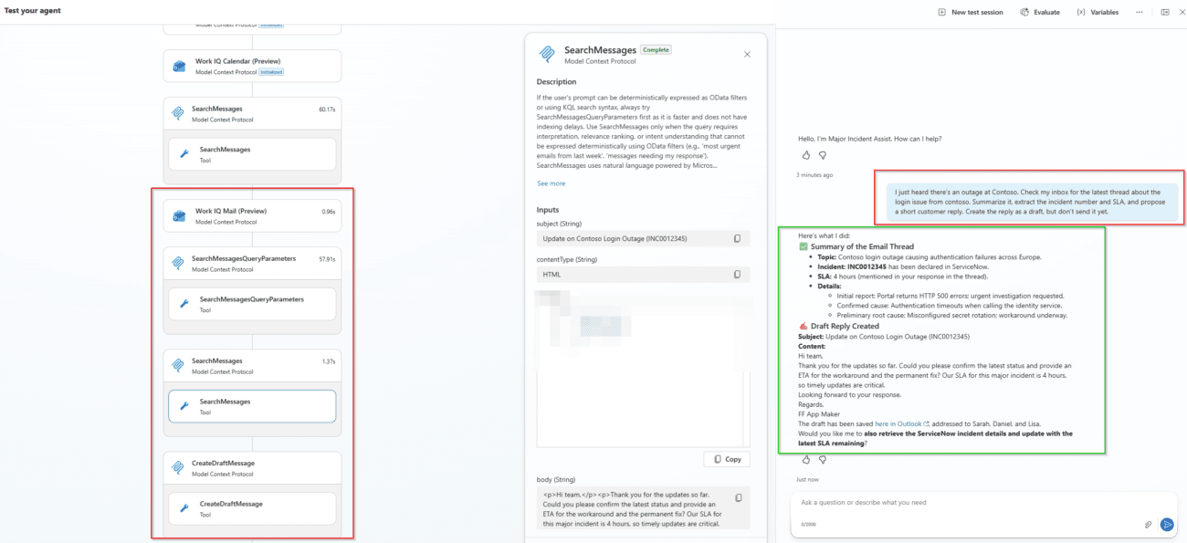 Finally, Copilot Studio agents extended with Work IQ MCP servers can safely act across Microsoft 365 and line‑of‑business systems, making them well suited for operational scenarios such as incident management, support, and knowledge‑driven workflows like the one we showed.
