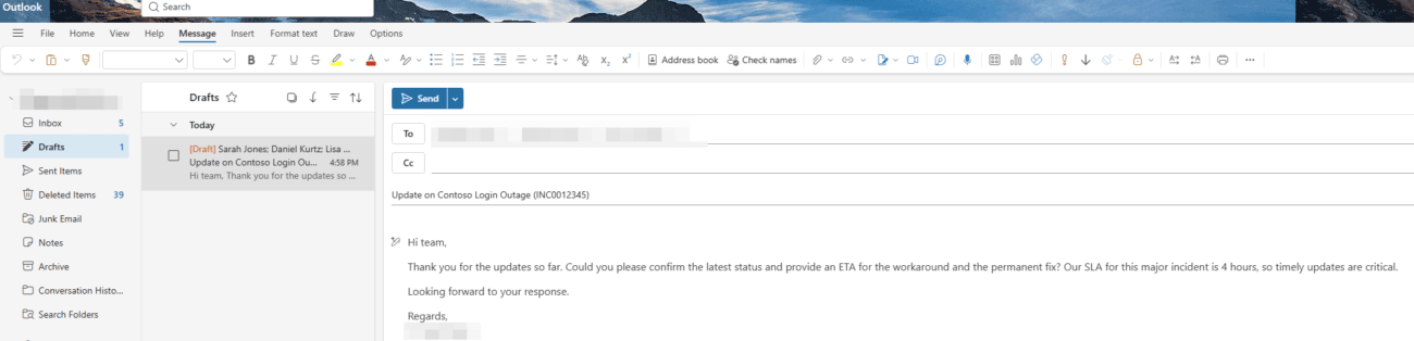 I just heard there’s an outage at Contoso. Check my inbox for the latest thread about the login issue from Contoso. Summarize it, extract the incident number and SLA, and propose a short customer reply. Create the reply as a draft, but don’t send it yet.