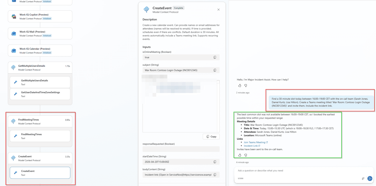 And in this case, the agent will use Work IQ Calendar MCP Server to find best time slot for all the team members: