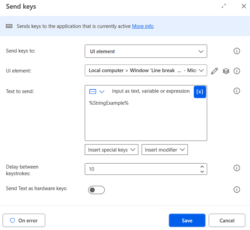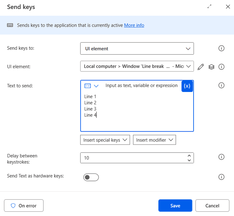 By default, Power Automate Desktop enters text using physical keystrokes. This mode handles most forms effectively by sending text precisely as a human would, but there’s a caveat: sending a linebreak as a human would means pressing the enter key. Doing so can have unintended consequences on some forms, such as submitting data early instead of creating a new line. To avoid this, Power Automate Desktop skips linebreaks.