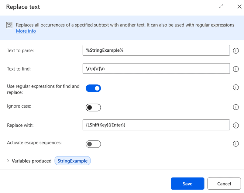 Other settings can be left at default values, although I recommend giving the produced variable a better name. If you don’t need the unaltered text elsewhere, consider saving your results to the original string to reduce clutter in the variables pane.