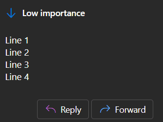 Since PAD emails use HTML encoding, you must replace carriage returns and newlines with <br> tags. If you’re manually writing the text, insert <br> as you see below: