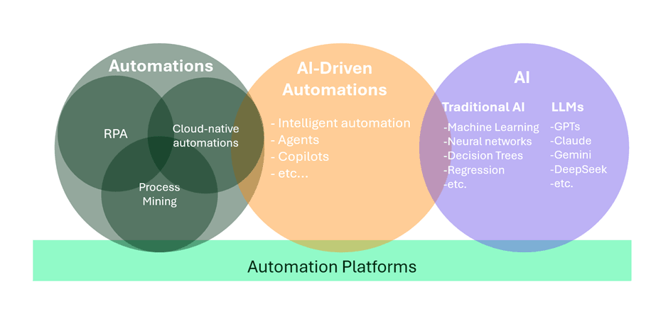 Now, when we start combining these automations with AI capabilities, either with just classic regression models etc. or the newer LLM-based solutions, we get what I refer as “AI-Driven Automations.” This is where all the trendy new names like agents, copilots, intelligent automations, and autonomous automations start popping up.